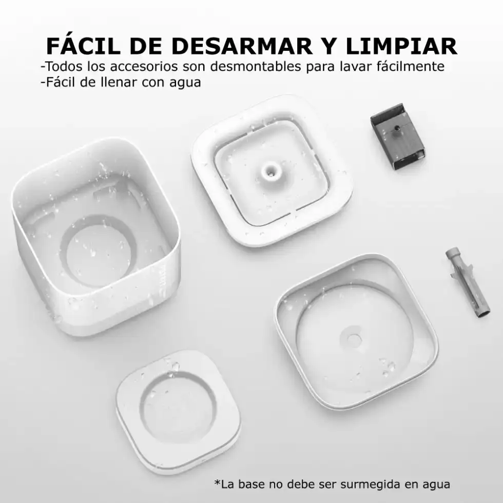 El diseño totalmente desmontable de la base y el contenedor facilita el llenado y la limpieza regular, ayudando a mantener una higiene óptima. Su material translúcido permite controlar fácilmente el nivel de agua, mientras que la luz LED inteligente indica cuándo el agua está baja y cuándo es momento de reemplazar el filtro. Gracias a su tamaño compacto y capacidad de 1.8 L, es ideal para mascotas pequeñas y medianas, ofreciendo autonomía y comodidad sin ocupar demasiado espacio.