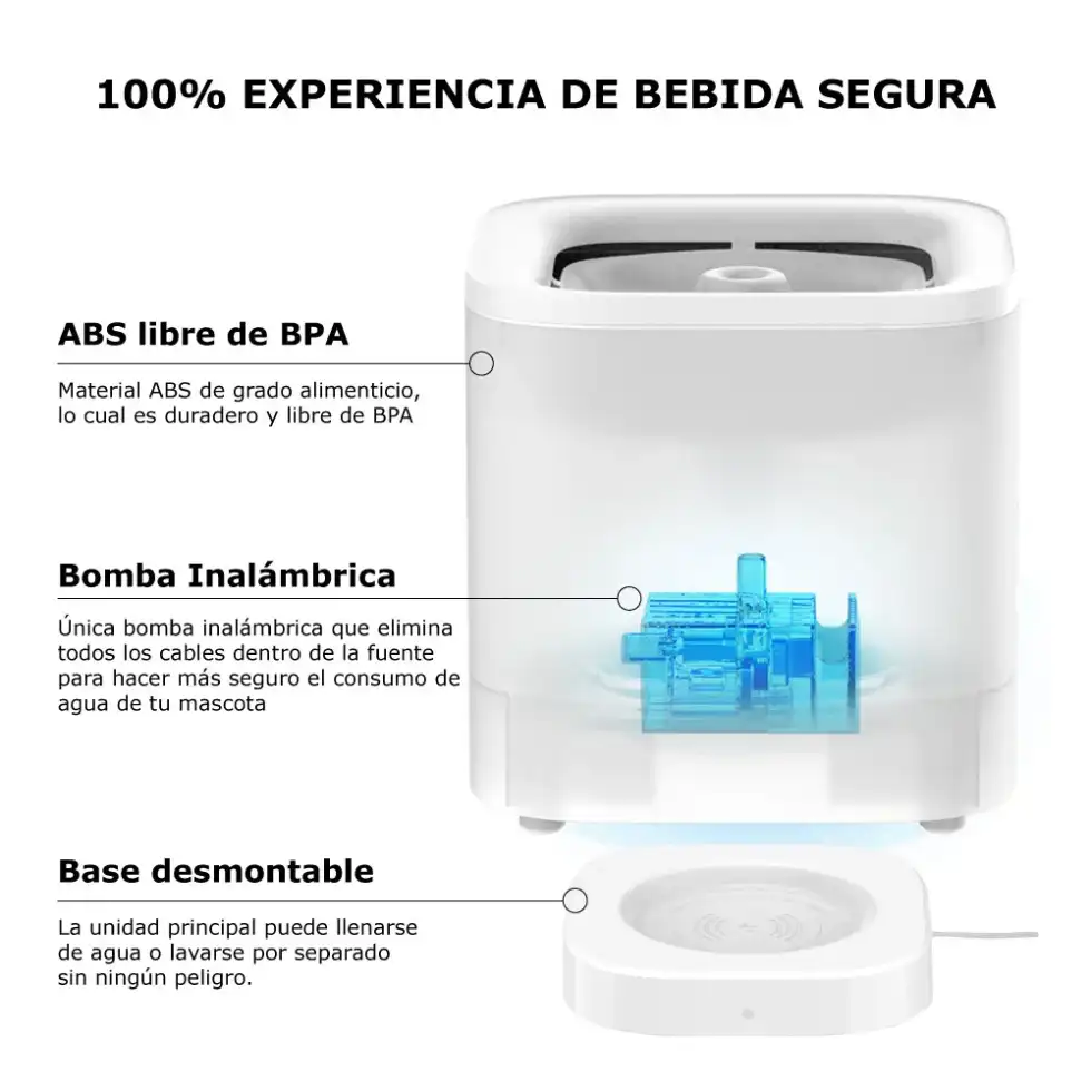 Equipada con bomba inalámbrica 3.0, esta fuente elimina por completo los cables en contacto con el agua, aumentando la seguridad durante el uso y facilitando la limpieza. Su funcionamiento es ultra silencioso (<35 dB), ideal para no generar molestias ni interrumpir el descanso del hogar. Incorpora protección contra funcionamiento en seco, por lo que la bomba se detiene automáticamente cuando el nivel de agua es bajo, evitando daños al dispositivo y garantizando un uso seguro para tu mascota.
