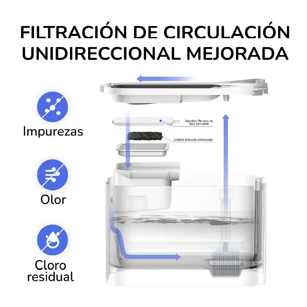 Esta fuente está diseñada para simular el movimiento del agua tipo manantial, animando a tu gato a beber más y mantenerse hidratado. Incluye filtros de triple filtrado profesional, que eliminan impurezas y garantizan agua limpia y purificada. Además, su recipiente superior está fabricado en acero inoxidable, brindando un nivel extra de durabilidad e higiene.
