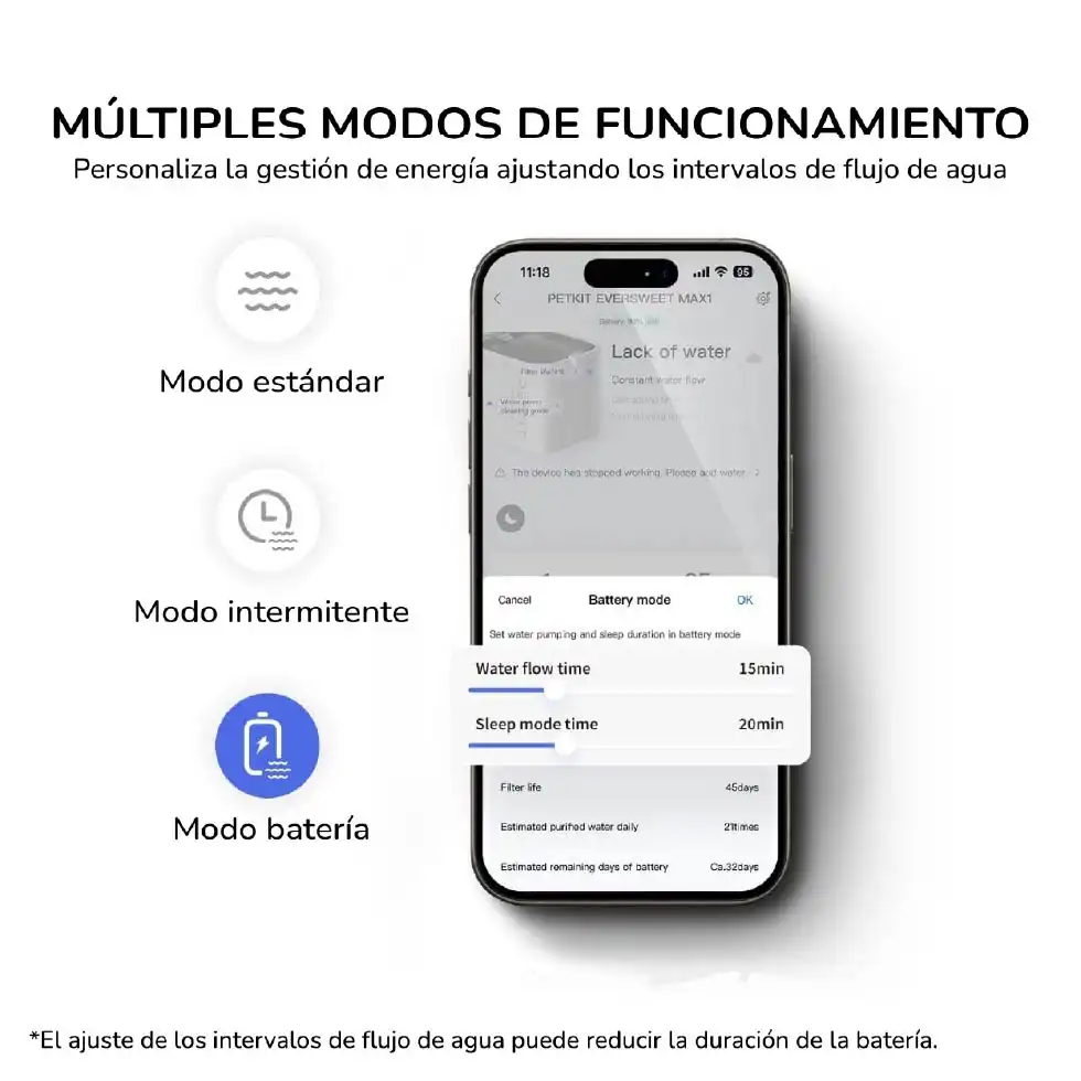 La Eversweet Max lleva la interacción al siguiente nivel gracias a su compatibilidad con una aplicación móvil. Con ella, puedes registrar información útil sobre los hábitos de hidratación de tu gato, como el tiempo que ha pasado bebiendo agua. El sensor de movimiento también optimiza el flujo y almacenamiento de agua según la actividad de tu mascota, haciendo que este producto sea una verdadera incorporación tecnológica al cuidado animal.